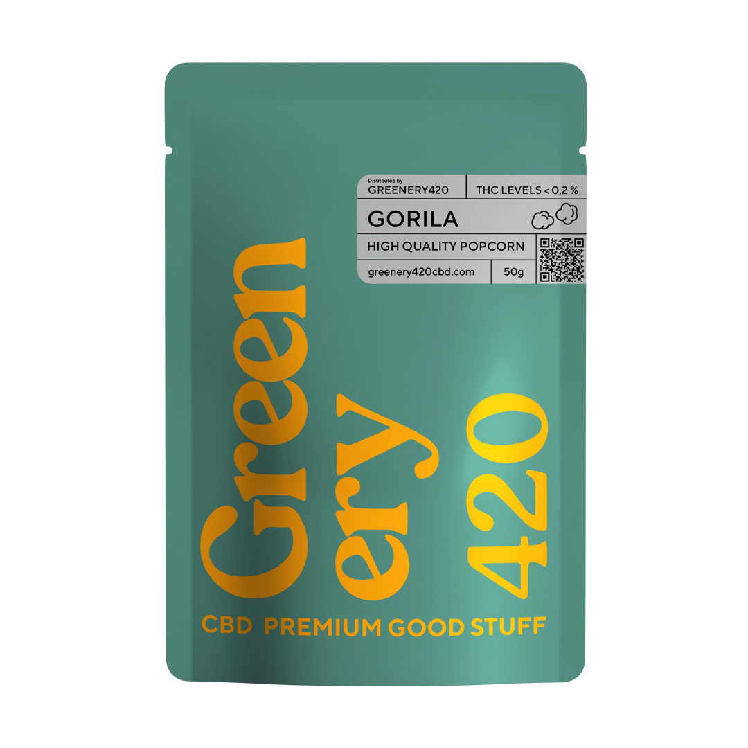 Les fleurs de popcorn de CBD Gorilla, par Greenery Elles ont un indice de THC inférieur à 0,2 % et proviennent de souches de chanvre à partir de graines certifiées par l’Union européenne, cultivées sans pesticides ni herbicides, entièrement biologiques et respectant toutes les normes de qualité GACP.