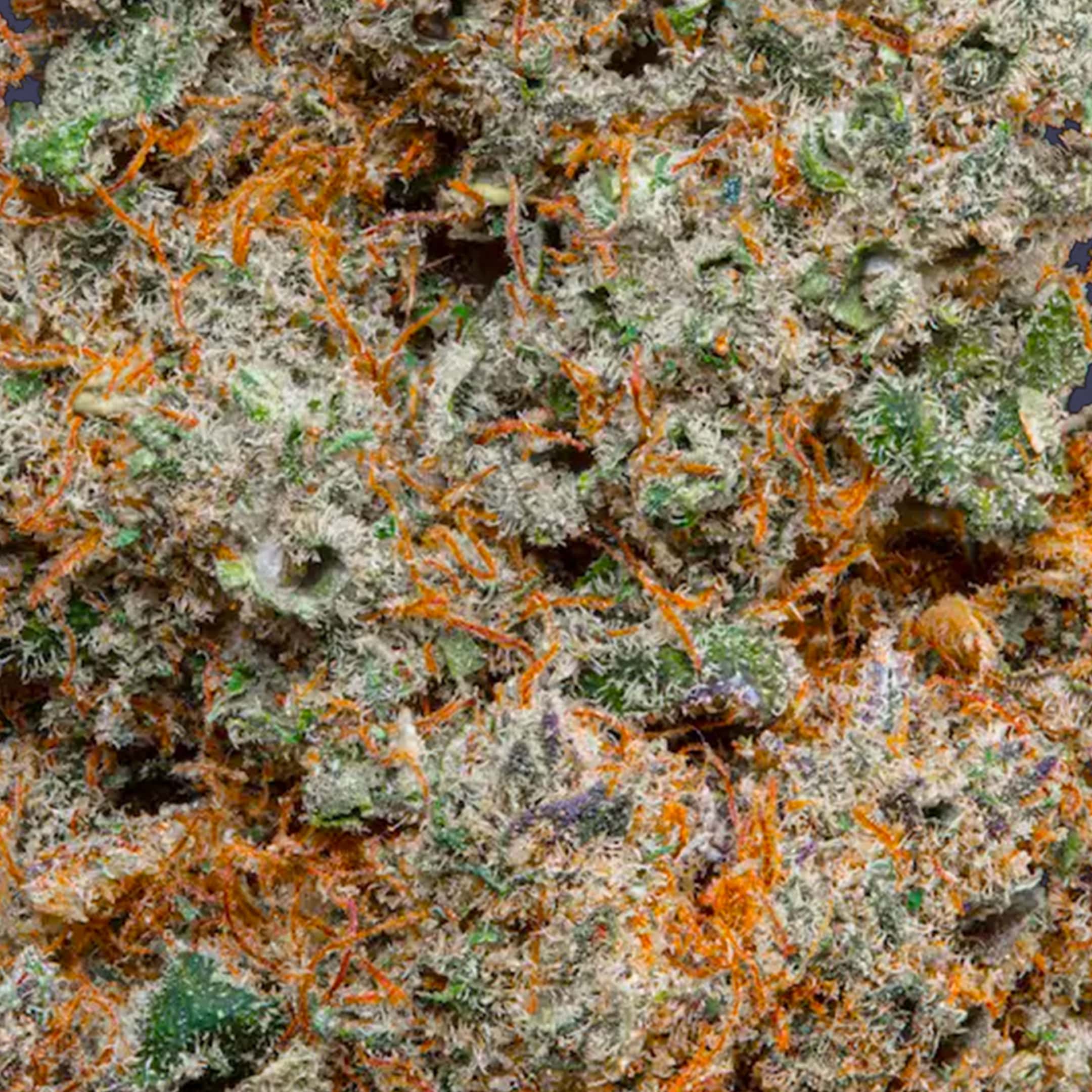 Les fleurs de Mela Sour sont denses et résineuses, avec une structure robuste qui montre leur haute qualité. Les bourgeons présentent une couleur verte vibrante avec des pistils orange et des trichomes brillants, reflétant leur pureté et leur puissance.